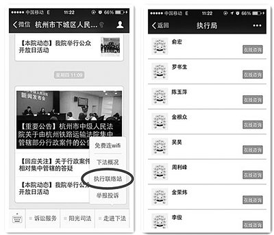 为解决当事人反映的“执行法官难找”问题,加上微信普及率越来越高,下城法院在自己的官方微信公众号上开设“执行联络站”,通过微信平台绑定执行法官的个人微信账号,实现网络即时“一对一”联络。从此,当事人想联系执行法官不再需要一趟一趟地往法院跑,也不用一次一次地给执行法官办公室打电话,只需要关注下城法院的官方微信公众号,找到“执行联络站”,即可与执行法官在线交流。