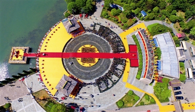 昨天,2016年公祭大禹陵典礼在绍兴大禹陵广场隆重举行。今年的祭禹典礼采用古代最高礼祭——“禘礼”。来自海内外的宾客来到大禹陵广场,追思华夏先祖的圣德伟业。现场鸣铳九响,寓意大禹平洪水、定九州的不朽功绩。图为祭禹典礼的航拍图。