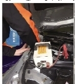 经过查看,佘冰冰发现桑先生的车上装有行车电脑,一旦断电,车载电脑中存储的数据会全部丢失,需要在不断电的情况下进行蓄电池更换,即先将新的蓄电池安装好,再将旧的蓄电池拆下。于是他取出帮电宝接好电,在保证不断电的情况下安全更换蓄电池。