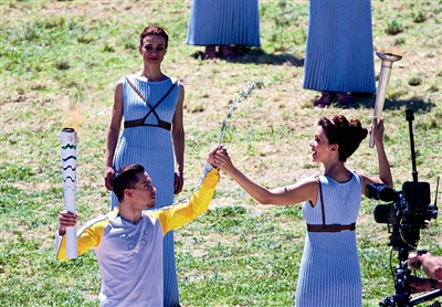 4月21日,扮演最高女祭司的希腊演员卡特里林娜·勒侯(右)在点火仪式上将象征着和平、胜利与荣耀的橄榄枝传递给第一棒火炬手、希腊体操运动员彼特罗尼亚斯。