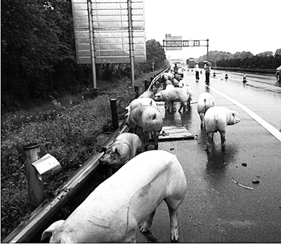 昨日中午11时许,S14杭长高速往杭州方向安吉北出口不到2公里处,一辆运载生猪的货车失控,撞上路边护栏导致车辆侧翻,车上的15头生猪全部滚出货车,过往车辆纷纷躲闪。