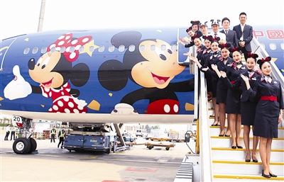 昨天,东航首架迪士尼主题彩绘飞机正式投入商业航班运营,执飞京沪航线。据介绍,东航将打造6架迪士尼彩绘飞机,预计2020年前逐步完成喷涂改装并投放市场。图为昨天在北京首都国际机场,东航首架迪士尼飞机的机组成员与飞机合影。