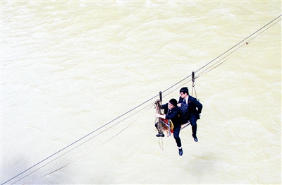 图为近日,第三人民法庭的书记员王威抱着国徽,和审判员舒涛一起完成在兴隆镇回龙村的走访后,乘坐溜索返回。