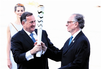 4月27日,希腊奥委会主席卡普拉洛斯(左)将里约奥运会火炬交给里约奥组委主席努兹曼。当日,里约奥运会圣火交接仪式在第一届现代奥运会举办地、雅典大理石体育场举行。