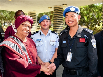 图为4月30日上午,利比里亚总统瑟利夫专程到利比里亚外交部接见了中国第四支驻利比里亚维和警察防暴队。