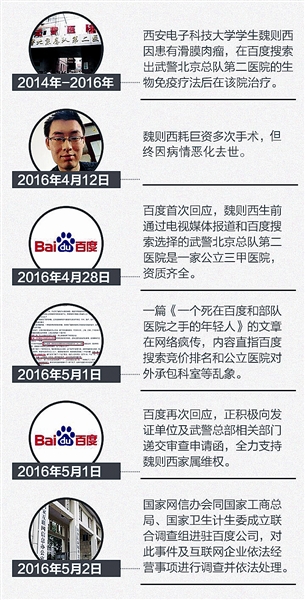 魏则西走了,但关于他的死,却引发了网络热议和社会的强烈关注。有网友发现,魏则西生前曾在网络社区“知乎”撰文,详述其曾通过百度搜索相关医院,花费巨资接受其所谓的“生物免疫疗法”等“新技术”的治疗,却最终贻误了其他合理治疗时机的过程。在他去世的半个月后,事件持续发酵,知名搜索引擎百度成为舆论焦点。
