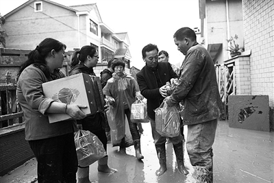 5月9日,在受灾严重的临安清凉峰镇新峰村,当地政府组织党员干部为村民送水送物资,帮助村民灾后自救,恢复生产生活。