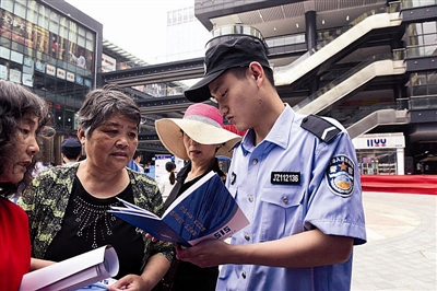 图为民警向市民发放防范经济犯罪资料并进行宣传。
