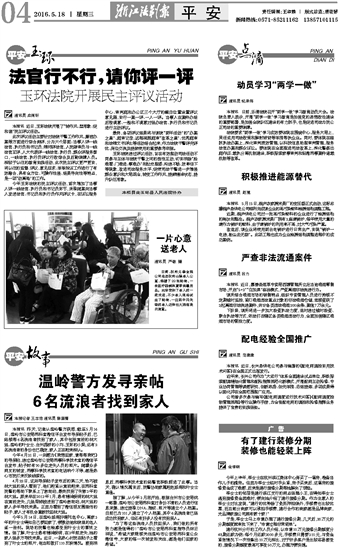 今年玉环法院的民主评议活动,首次增加了当事人评一线法官、执行员和书记员环节,采取随案向当事人发送法官、书记员和执行员作风评议卡,在诉讼服务中心、审判庭和办公区三个大厅的醒目位置设置评议意见箱,实行一案一评、一人一评。当事人在案件办结后按满意、一般和不满意对经办法官、执行员和书记员进行主动评议。