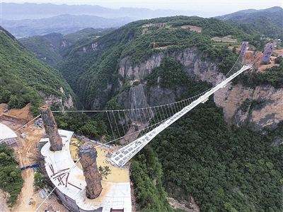 近日,湖南张家界大峡谷人行玻璃桥完成桥面玻璃安装。据悉,玻璃桥总长430米、宽6米,桥面距离谷底相对高度约300米。桥面全部采用透明玻璃铺设,最大游客容量为800人。目前,整个玻璃桥主体已经完工,游客中心进入内部装修收尾阶段,景区外部停车场扩建工程在建设中。