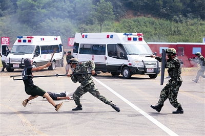 | 2014年8月22日,浙江省公安特警与武警浙江总队在义乌市举行“联训、联勤、联战”三联演练。 郭广杰 摄 |
