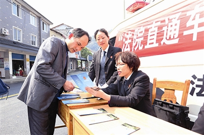 | 2014年3月25日,桐庐县“法院直通车”开进百江镇东辉村,工作人员现场受理婚姻家庭等纠纷案件,将普法工作延伸到田间地头。 徐军勇 商进 摄 |