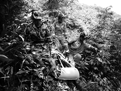 演练模拟5名游客在登山过程中被困,全副武装的救援人员进山搜救。在确定5名游客被困山崖下后,救援人员利用安全绳从崖顶缓降至底部,然后通过安全绳的牵引,将4名被困人员营救至安全区域。最后,救援人员把腿部受伤的游客固定在多功能担架上,合力营救下山。