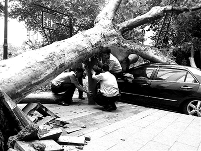 5月22日7时多,杭州上城区开元路63号有树倒下,将停在路边的一辆小汽车压扁,开元路也无法正常通行,好在无人员伤亡。上城区公安分局湖滨派出所接到指令后,立即抽调30多名警力赶赴现场处置。为确保安全,民警迅速拉起警戒带,劝导无关人员不要在周边逗留。随后,交警、城管、市政、街道、消防等部门相继赶到现场,一边对树木枝干进行锯割,一边及时清理。经过大家的共同努力,开元路终于恢复通行。
