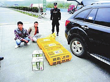 3个黄色有孔塑料筐共装着6只小熊猫,其中2只已经死亡;另外还有用黄色编织袋装着的2只活体白腹锦鸡。后座上放着2个空啤酒箱,里面是4只活体楔尾绿鸠。