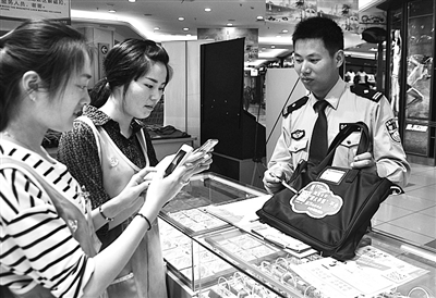 图为昨日,该局武原派出所社区民警在走访商铺过程中,邀请店员加入“群众举报”微信公众平台。