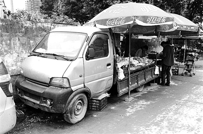 | 石亭路沿线的水果摊开在了废旧面包车上 |