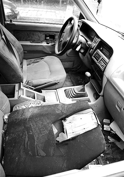 | 车窗破损的“僵尸车“里很脏很乱 |