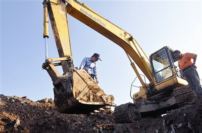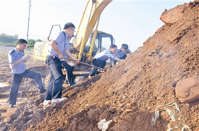 5月17日下午,金东公安分局组织20余名警力,动用了两台挖掘机,在划定区域内进行挖尸骨作业。因为老村址上被填入近4米深的泥土,挖掘进行得十分小心。