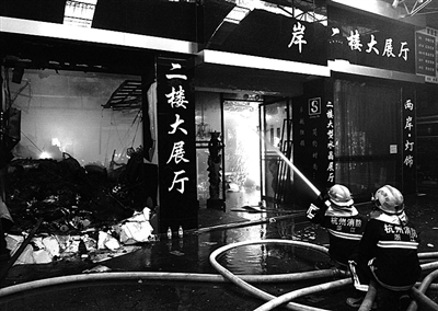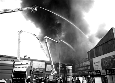 起火的建筑为二层商铺,主体为砖混结构,顶棚及梁为钢架结构。起火位置为市场西侧的仓库位置,不时有全副武装的消防官兵从市场各个通道进出火场,从火场周边架设立体式的水枪阵地,防止火势向周边蔓延。
