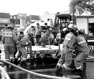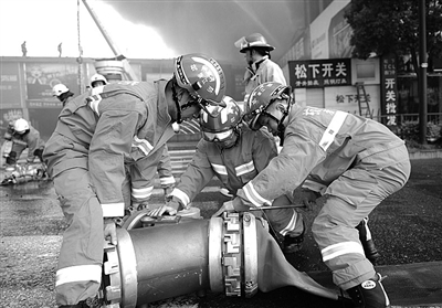 16时40分,战保大队的消防官兵赶到现场,立即在现场铺设一套远程供水系统,保证现场所有中队水枪出水需要。