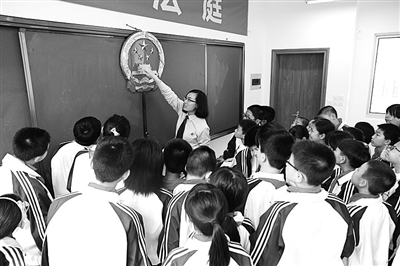 图为该院组织模拟法庭进校园活动,法官向学生介绍国徽的由来和含义。