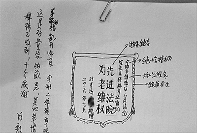 收到样稿后的冯大爷很感动,尽管案子还没立起来,但他还是想先给张凯月送一面锦旗表示感谢。张凯月再三告诉冯大爷,千万不要破费制作锦旗。于是,冯大爷就寄来了这面手绘锦旗:“尊敬的张凯月法官,今附上锦旗草稿,征求意见,修改后寄回,以便定制。这是对贵院的感恩,您所寄的起诉状样稿已收到,十分感谢。”