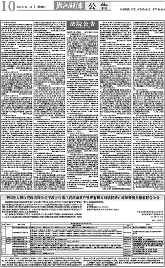 中国光大银行股份有限公司宁波分行浙江省浙商资产管理有限公司债权转让通知暨债务催收联合公告