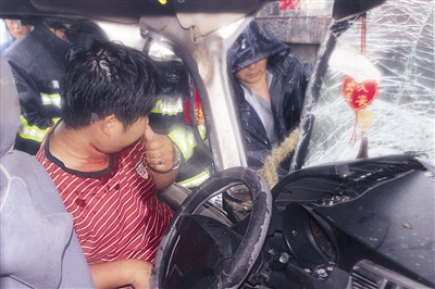 | 消防员冒暴雨营救车祸被困司机 |