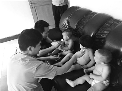 小家伙们到了派出所,一会在办公室里到处爬,一会坐着休息还流着口水,并且看见什么都往嘴里塞。面对这3个宝贝,乾潭派出所的小伙子民警只能是抓耳挠腮了。还是陈勇华有经验,他家里有一个2岁的孩子,他指挥民警分工,一组负责逗孩子、擦口水,哭了就抱起来抖抖,看住他们别往嘴里乱塞东西;另一组出门买牛奶,还有新衣服。