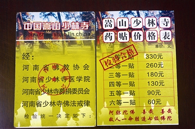 这些“和尚”每到一地,就先发传单给村民,表示晚上有少林寺和尚的表演,吸引村民前往观看。在一番简单的表演结束后,他们就找看表演的村民聊天,问村民身体哪里不舒服或有何病痛,然后忽悠说他们可以用气功帮治病,治病时就给贴上一帖膏药,再拿出价目表告诉村民膏药多少钱,一帖从几十元到100多元,有时还会不经村民同意就在其身上多贴几帖,强买强卖。