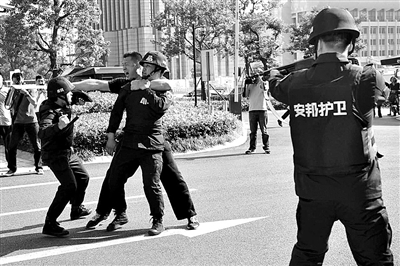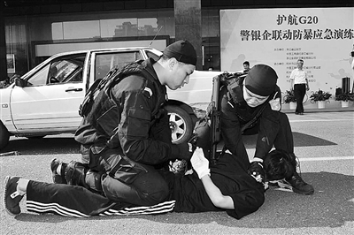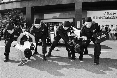 这惊险的一幕,就发生在昨天下午。其实,这是由浙江省公安厅、工行浙江省分行和省安邦护卫集团共同主办的“护航G20·警银企联动”防暴应急演练活动。