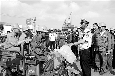 昨天下午,舟山市普陀区小干岛欧华造船厂里热闹非凡,近百名企业员工在交警的指导下,现场模拟体验电动自行车、三轮电动车违法载人等各种违法行为带来的危险。