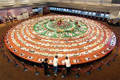 当日,一场以硅化木、玛瑙、玉石、火山石、鸡血石等组成的“奇石宴”亮相哈密奇石文化博物馆。该“宴席桌”直径达16.8米,面积约200平方米,摆放了1088道“特色菜品”,吸引了众多游客前来参观。