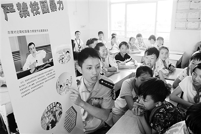 昨天,台州市金清边防派出所警官向金清镇腰塘小学学生开展校园反暴力行为宣传教育。
