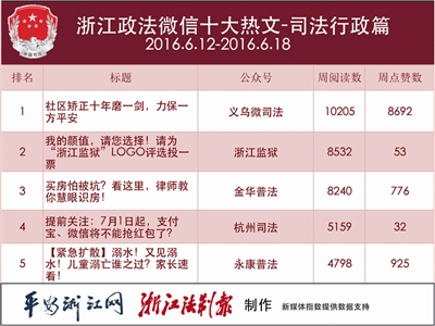 再看热文榜,“义乌微司法”的《社区矫正十年磨一剑,力保一方平安》以10205的周阅读数傲居第一;“浙江监狱”的《我的颜值,请您选择!请为“浙江监狱”评选投一票》,以影响力取胜,获得第二;“金华普法”的《买房怕被坑?看这里,律师教你慧眼识房!》,将普通的以案说法做精做细,融入原创漫画,最终捧获第三。