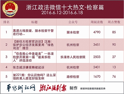 再看热文榜,正能量题材受热捧。“丽水检察”的《高速火线救援,丽水检察干警在行动……》以4790的周阅读数拔得头筹;“乐清市人民检察院”的《“你在我心中是最美”——乐清检察开展第一届“最美乐检人”评选活动》获得第三名。多家公号强势来袭,“丽水检察”有2篇文章入榜、“杭州检察”有3篇文章入榜。