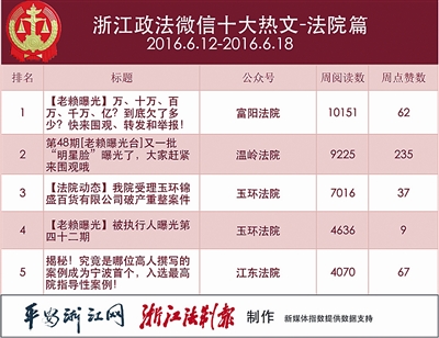再看热文榜,“老赖”仍是绕不开的热门话题。“富阳法院”的《【老赖曝光】万、十万、百万、千万、亿?到底欠了多少?快来围观、转发和举报!》以10151的周阅读数占据鳌头;“温岭法院”的《第48期[老赖曝光台]又一批“明星脸”曝光了,大家赶紧来围观哦》以9225的周阅读数位居第二。俗话说:“人要脸、树要皮”,“老赖”们,难道你们经得住这样天天被曝光?实在不光彩啊!