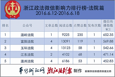 本周法院榜前三迎来了“大换血”。“温岭法院”凭借强势表现,夺得榜首;“富阳法院”“玉环法院”上升明显,分别占据了第二、第三的高位,让人刮目相看。