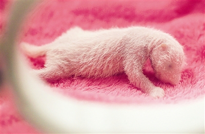 6月20日,成都大熊猫繁育研究基地的雌性大熊猫“雅莉”顺利诞下一对雌性双胞胎宝宝,大仔出生时间为5时52分,初生体重144克;小仔出生时间为6时2分,初生体重113克,它们成为2016年全球首对新生圈养大熊猫双胞胎。图为双胞胎中的一只。