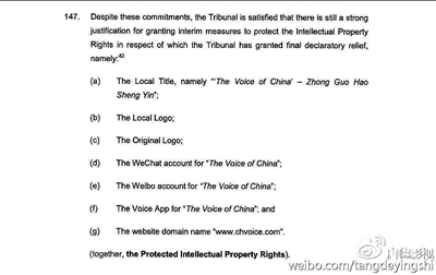 唐德公司对此的理解是,“仲裁庭认为,该节目中文名称‘中国好声音’五个汉字的权属,可能需要通过找专家听证来进行判断,因此决定在后续的审理中再对中文节目名称‘中国好声音’的权属问题做出判断和裁决。”