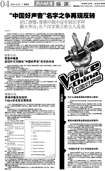 再回到“中国好声音”这五个字之争,方双复说,虽然都与“中国好声音”这五个字有一定关联,但Talpa在香港的仲裁之举与唐德公司在北京申请诉前禁令,其侧重点并不一样。Talpa关注的是“中国好声音”五个中文字组成的节目名称,而唐德公司则侧重的是商标权。