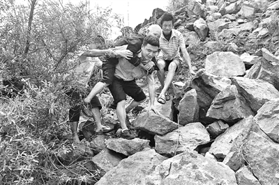 | 6月27日,白塔派出所民警将一位误入溪边乱石坝遇险的89岁老汉救下,背回家中。通讯员 曹红兵 摄 |