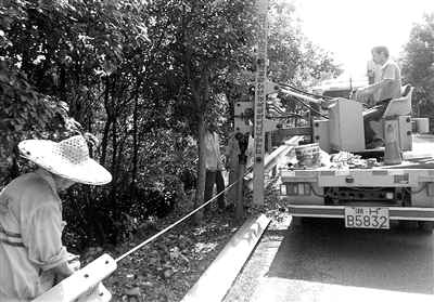 图为施工人员在城华线上安装波型钢质防撞护栏。