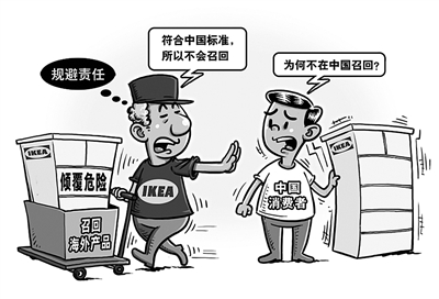 由于在美国已造成6名儿童死亡,瑞典家具制造商宜家近日宣布,正在美国和加拿大召回约3600万件容易倾倒的家具,但因相关家具符合中国相关标准所以不会在中国召回,引发舆论热议。标准或许存在国别差异,维护消费者生命安全的企业责任不应中外有别。企业只有把生命安全放在首位,主动消除产品安全隐患,才能赢得消费者信赖。