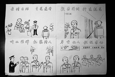 陈路东说,在监狱里,服刑人员的文化程度参差不齐,有的小学都没毕业,学习书本知识较为困难。为了方便理解,陈路东将服刑人员的日常行为规范画成一幅幅漫画,用生动的卡通形象让服刑人员明白,哪些事情是禁止的,哪些行为是规范的。