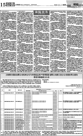上海银行股份有限公司杭州分行与中国信达资产管理股份有限公司浙江省分公司债权转让通知 暨债务催收联合公告