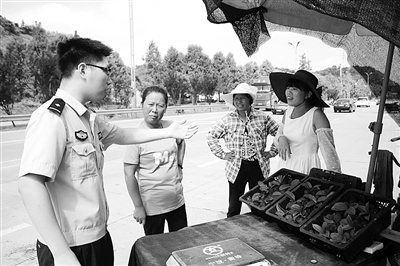 眼下正是杨梅等水果上市的季节,不少村民不顾危险,跑到公路边摆摊卖水果。昨天上午,临海市公安局杜桥派出所社区民警,来到高速公路口和马路边,劝导在这里卖水果的村民收摊离开。