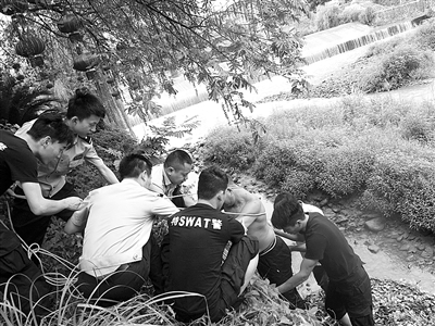 民警应忠果断绑起救生绳,跳入河中。由于近日受台风影响,雨水较多,导致河水上涨,水流湍急。为了确保男子的安全,应忠将自己身上的救生绳绑在男子身上,在岸边民警和群众的合力帮助下,成功将该男子拉上岸。经现场确认,男子无生命危险。