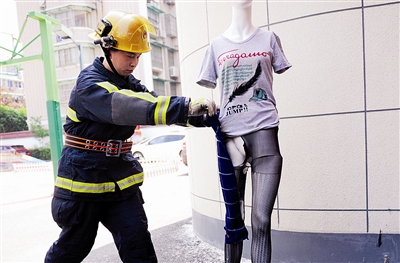 实验开始前,考虑到人体表面的油脂和毛发具有助燃作用,负责现场实验的中队一班班长张杰先在假人模特的腿上涂抹了少量助燃剂,然后将一双黑色丝袜穿到模特身上。